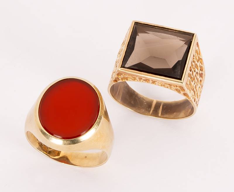 Gold 585. Ein Ring mit ovaler Carneolplatte (ca. 16 x 14 mm). Ein Ring mit rechteckigem Rauchquarz ( ca. 15 x 14 cm). Je in der Schiene punziert. Ringgröße ca. 63/20 bzw. 67/21. Gesamtgewicht ca. 15,1 Gramm. (A39)