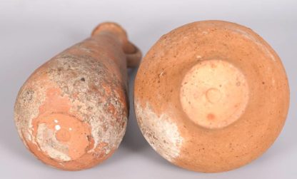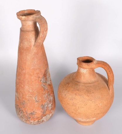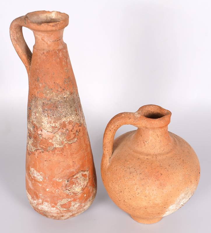 Zwei Kannen Wohl römisch. Roter Scherben. Je eine Handhabe, einmal kugelig, einmal gestreckt. Durchmesser ca. 8/11 cm, Höhe ca. 23/14 cm. Teils berieben und stärker bestoßen. Altersbedingter Zustand wie abgebildet. Aufgrund der schwierigen Sachlage kann keine Garantie für Herkunft oder Alter übernommen werden. Bitte besichtigen Sie selbst. Wir machen darauf aufmerksam, dass dieser Gegenstand nicht aus Deutschland ausgeführt werden darf.