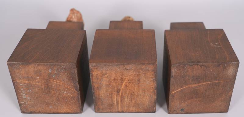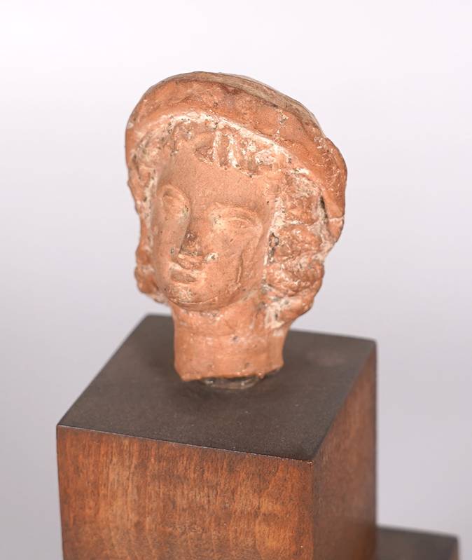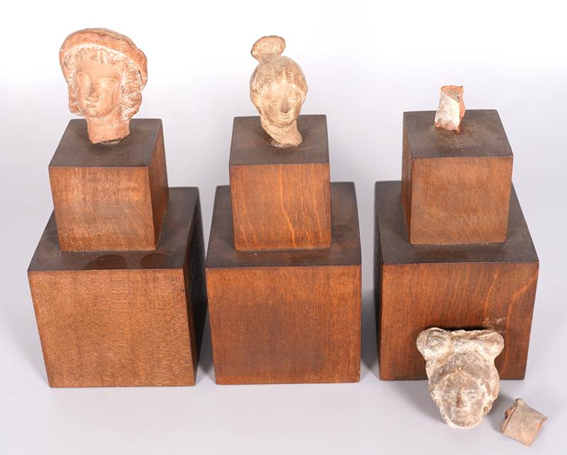 Drei Köpfe Wohl griechisch. Terracotta. Drei wohl Frauenköpfe auf Holzsockel. Größe der Köpfe je ca. 3,5 x 2,5 cm, Höhe je ca. 5 cm. Einmal vom Sockel gebrochen. Teils berieben und stärker bestoßen. Altersbedingter Zustand wie abgebildet. Aufgrund der schwierigen Sachlage kann keine Garantie für Herkunft oder Alter übernommen werden. Bitte besichtigen Sie selbst. Wir machen darauf aufmerksam, dass dieser Gegenstand nicht aus Deutschland ausgeführt werden darf.