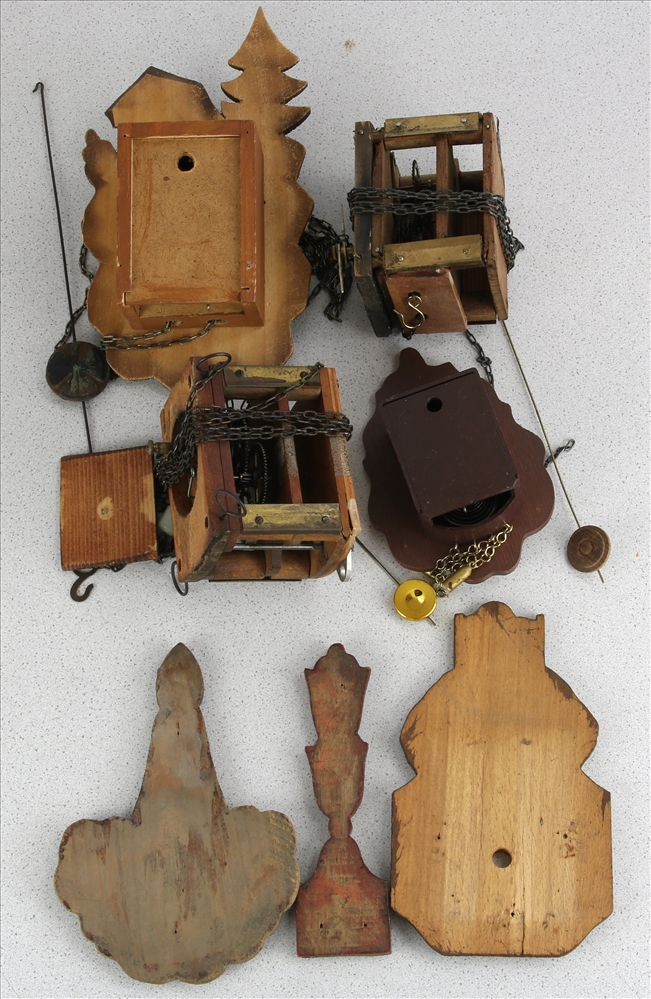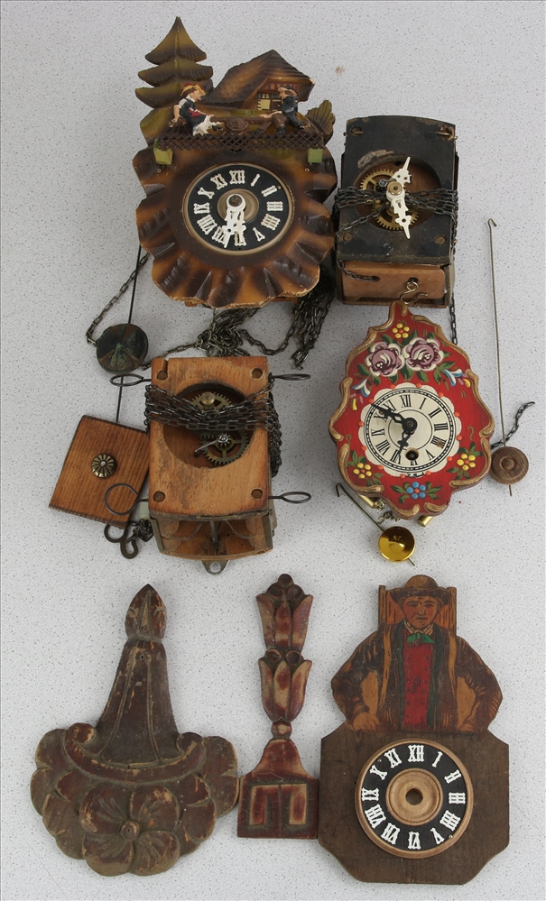 20. Jh. Diverse Uhren und Uhrenteile mit mechanischen Werken. Größte ca. 11 x 7,5 cm, Höhe ca. 19 cm. Altersbedingter Zustand, nicht geprüft.