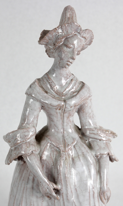 Platzer, Fini 1913 Innsbruck - 1990 Thaur. Glasierte Keramik. Dame in Tracht. Durchlässige, helle Glasur. Unter dem Boden signiert. Größe ca. 13 x 11,5 cm, Höhe ca. 27 cm. Produktionsbedingter Riss im Boden.