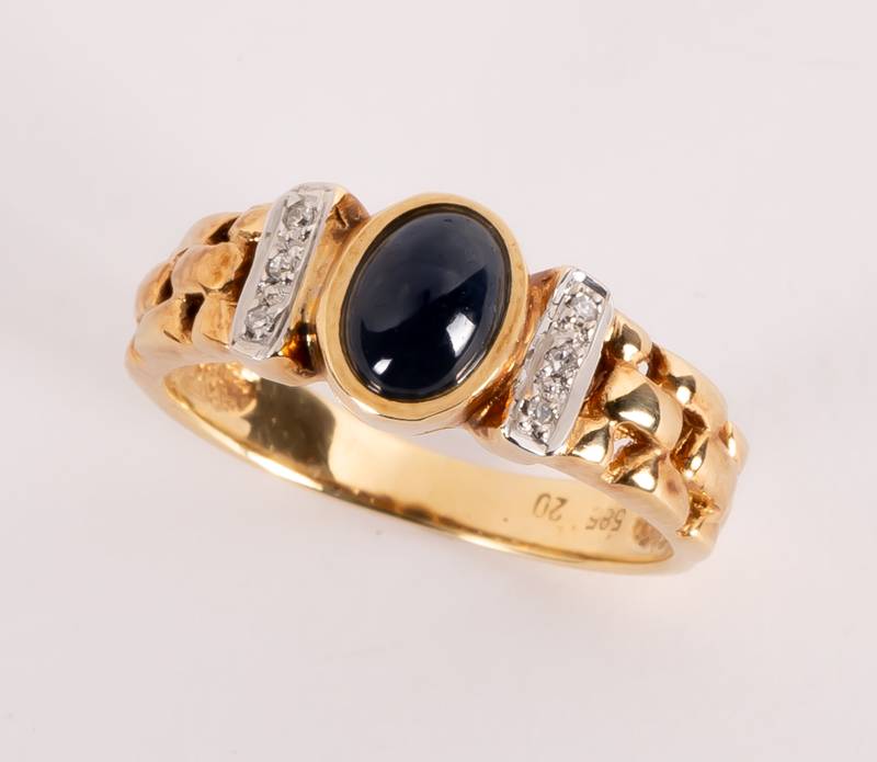 Gelbgold 585. Durchbrochen gearbeitete Ringschiene mit zentralem Saphir -Cabochon (ca. 1 Carat), flankiert von zwei Weigoldbändern mit je drei Punktdiamanten. In der Ringschiene punziert. Ringgröße ca. 54/17, Gewicht ca. 3,6 Gramm. (A43)