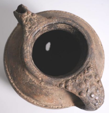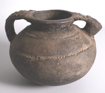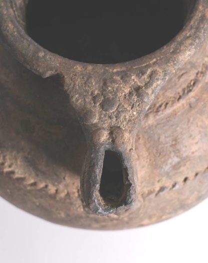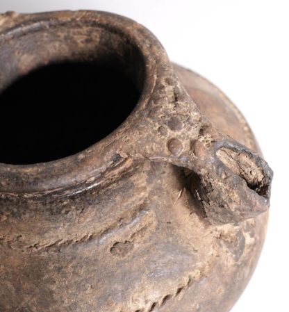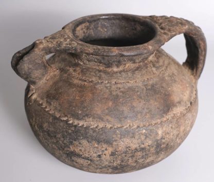 Wohl germanisch. Dunkelgrauer Ton. Bauchige Kanne mit einer Handhabe und hochangesetztem Ausguss. Durchmesser ca. 19 cm, Höhe ca. 15 cm. Teils berieben und stärker bestoßen. Altersbedingter Zustand wie abgebildet. Aufgrund der schwierigen Sachlage kann keine Garantie für Herkunft oder Alter übernommen werden. Bitte besichtigen Sie selbst. Wir machen darauf aufmerksam, dass dieser Gegenstand nicht aus Deutschland ausgeführt werden darf.