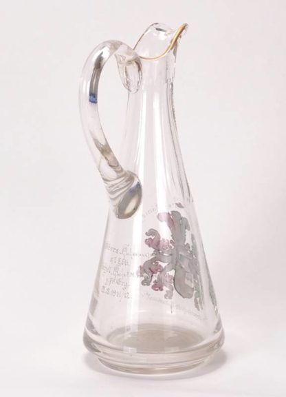 Verbindungskrug Deutsch 1911/12. Henkelkrug mit aufgemaltem Wappen in Grün, Rot und Gold sowie Gravur auf der Vorderseite. Ascania sei´s Panier! Ehre-Freundschaft-Vaterland! Rückseitig eingraviert F. Peters ... H. Siegel ... M.S. 1911/1912. Durchmesser ca. 9,5 cm, Höhe ca. 22 cm.