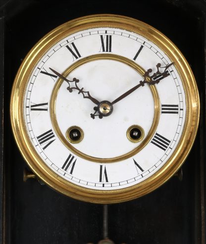 Gustav Becker um 1900. Dreiseitenverglastes Holzgehäuse mit schönen Applikationen. Emaillezifferblatt mit schwarzen Zeigern und lateinischem Nummernkreis. Pendulenwerk mit Schlag zur halben und vollen Stunde auf Tonfeder. Werk hinten gemarkt und nummeriert 912237. Größe ca. 35 x 14 cm, Höhe ca. 72 cm. Altersbedingter Zustand, läuft an und schlägt.
