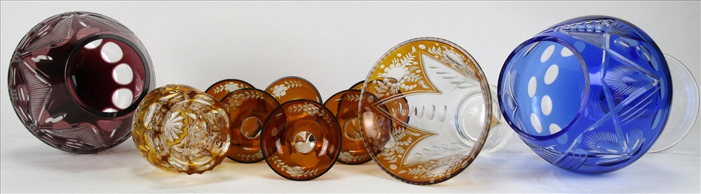 Deutsch. Insgesamt 10 Teile Farbglas der 1930-er bis 1950-er Jahre. Höhe der beiden Pokale je ca. 19 cm. Ein Likörglas etwas bestossen, sonst gut.