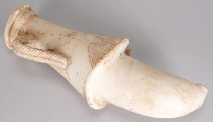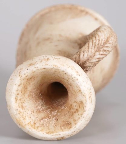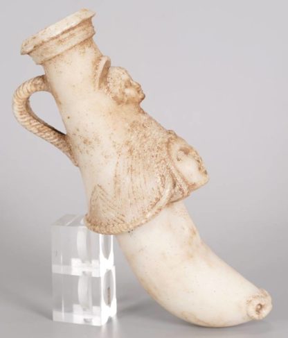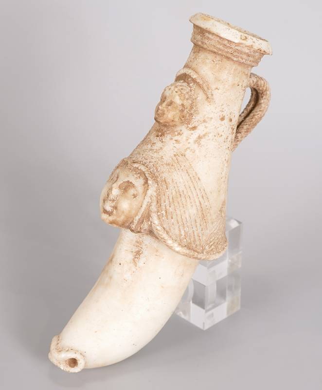 West-Asiatischen 2.-3. Jh. n. Chr. Rhyton mit Muttergöttin und Kind. Alabaster. Hornförmiger Korpus mit einem Henkel. Zentral der Kopf einer weiblichen Göttin. Darüber ein Kindergesicht und einem sichelförmigen Bogen. Größe ca. 7 x 9,5 cm, Höhe ca. 20,2 cm. Gewicht ca. 951,2 Gramm. Provenienz: Aus der Sammlung Zelnik Istvan Southeast Asian Gold Museum. Dr. Istvan Zelnik, Präsident des Ungarischen Süd- und Südostasiatischen Forschungsinstituts, ist ein ehemaliger ungarischer Diplomat, der mehrere Jahrzehnt in Südostasien verbrachte und die größte bekannte Privatsammlung asiatischer Kunst in Europa aufbaute.