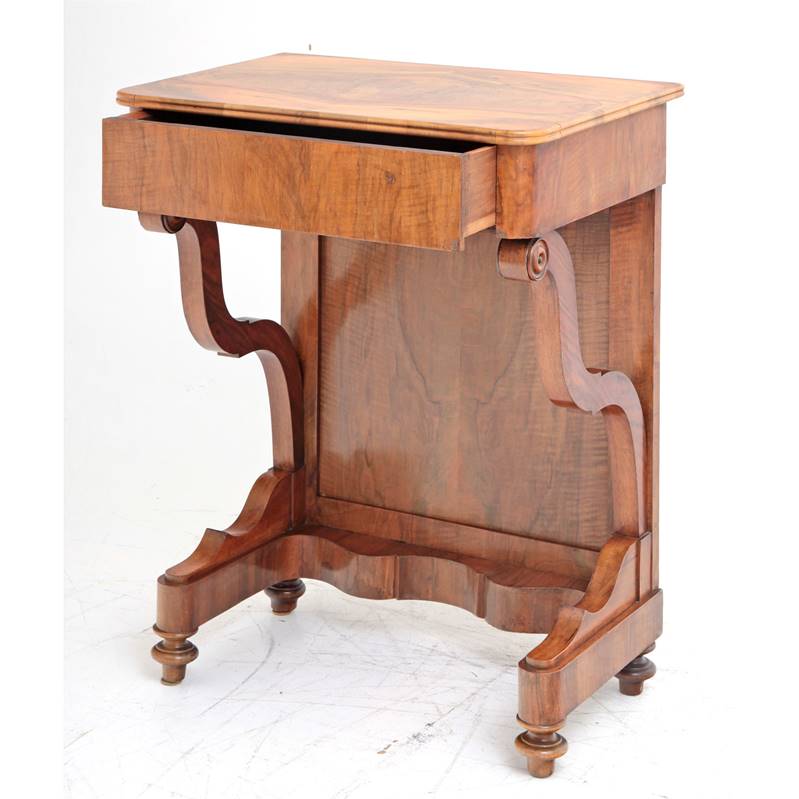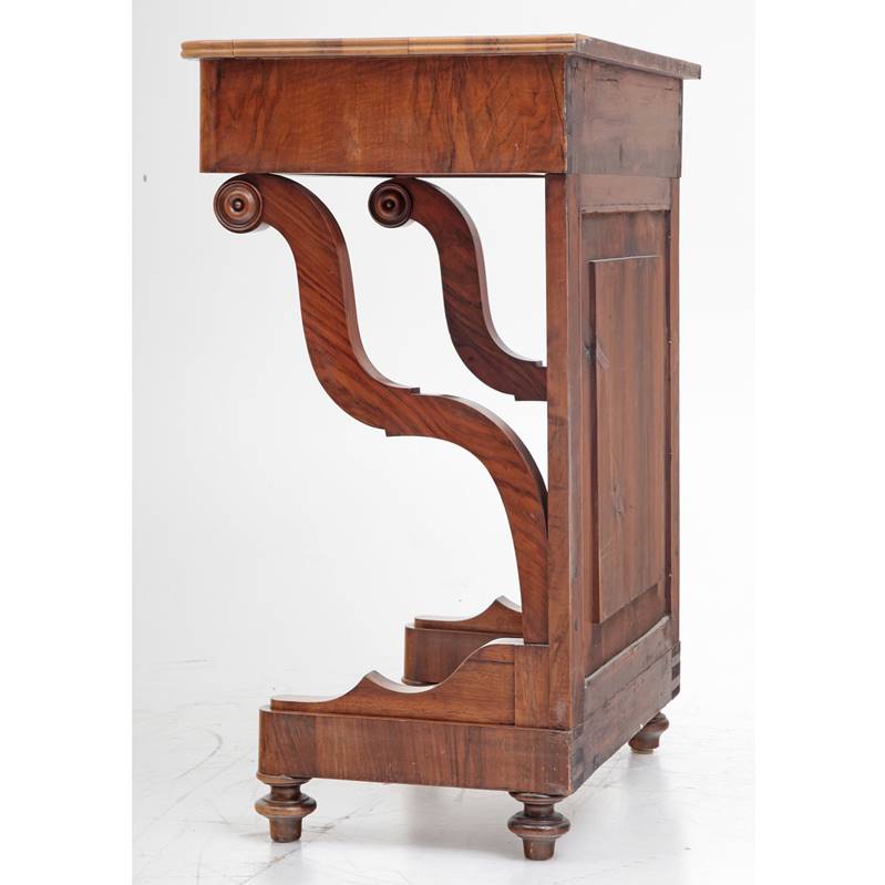 Süddeutsch um 1830. Nussbaum, furniert. Die tief eingezogene Bodenplatte dieses ungewöhnlichen Möbels sitzt auf fein gedrechselten Füßen. Der Schwung der Oberfläche setzt sich in den volutierten Seitenstäben samt regionaltypischen Rosettenapplikationen und in den eingestellten Volutenbeinen fort. Sinnfällig drücken diese in ihrer Bewegung das Tragen des Zargenschubes aus. Ein in seiner Gestaltung seltenes Möbel von überraschender Leichtigkeit. Größe ca. 63 x 45 cm, Höhe ca. 86 cm.