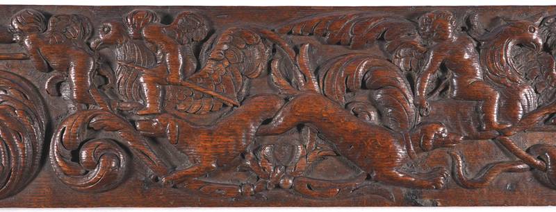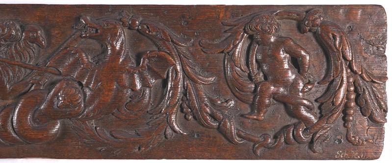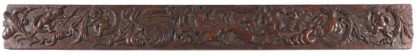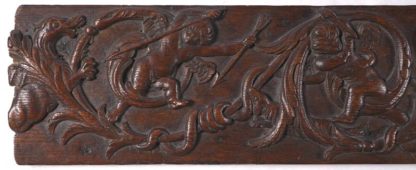 17./18. Jh. Holz, geschnitzt. Paneel mit reliefiertem, figurativem Dekor. Amoretten bei der Jagd. Unten rechts schwer leserlich bezeichnet. Größe ca. 15,5 x 135 cm, Gewicht ca. 2 kg.