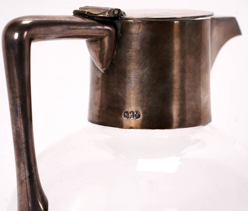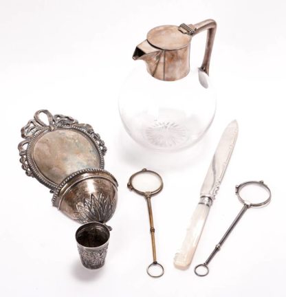 Konvolut Versilbertes Ein englisches Messer, zwei Lünette, ein Becher, eine Wandapplike und eine Glaskaraffe mit versilberter Montur. Durchmesser der Karaffe ca. 14 cm, Höhe ca. 16 cm. Zustand wie abgebildet.