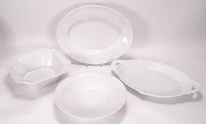 Königliche Porzellanmanufaktur Berlin 20. Jh. Dekor Kurland. 8 große und 8 kleine Suppenteller, 8 Vorspeiseteller, 8 Speiseteller, sechs Kaffeetassen mit Unteren, ein Sahnegießer, eine runde Schale und eine achteckige Schale, eine ovale Platte und eine Sauciere mit Löffel (ungemarkt). Je unter dem Boden unterglasurblaue Zeptermarke. Dazu eine ovale Platte von Fürstenberg. Größe der ovalen Platte ca. 33 x 26,5 cm.