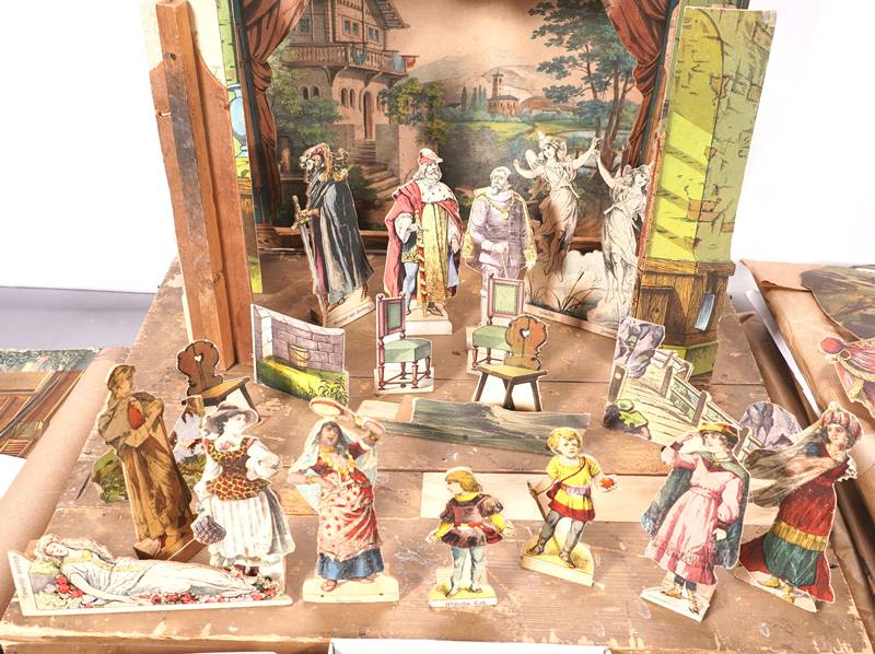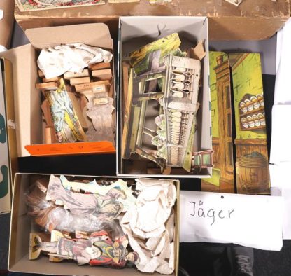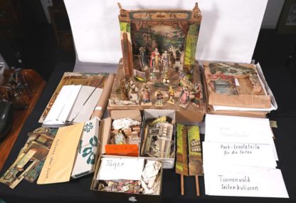 Um 1900. Reichhaltiges Zubehör mit diversen Figuren und Hintergrund- und Seitenkulissen. Unter anderem Rittersaal, Königsburgsaal, Wald, indischer Palast, Hafen, Dschungel, Parklandschaften, Durchsichtkulissen und vieles mehr. Größe des originalen Holzkoffers ca. 52 x 47 cm, Höhe ca. 10 cm. Zustand wie abgebildet, bitte selbst besichtigen.