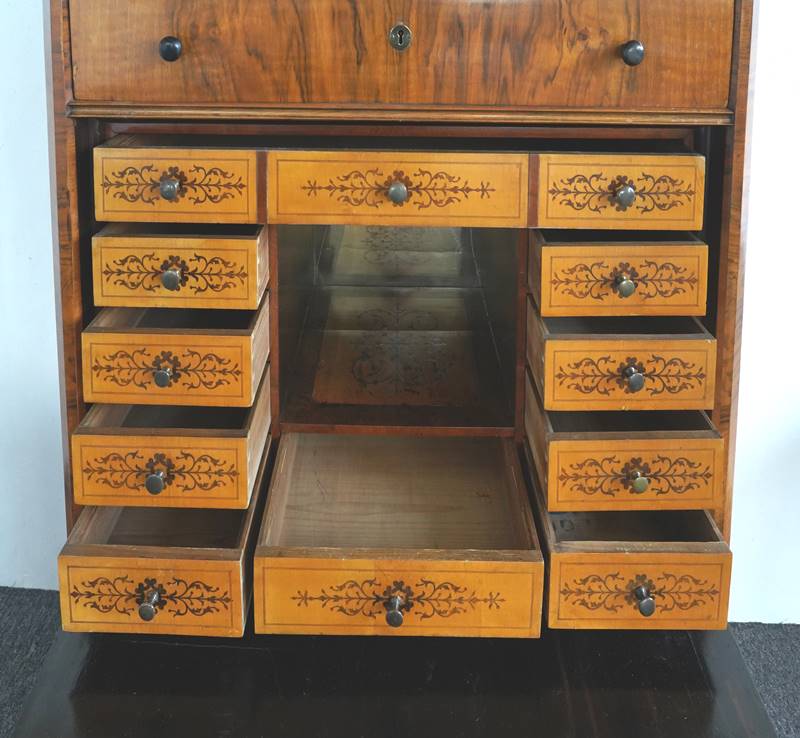 Biedermeier Sekretär Deutsch 19. Jh. Wohl Nussbaum/Kirschbaum teils ebonisiert. Dreischubiger Kommodenunterteil auf vier spitzen Füßen, darüber aufklappbare Schreibplatte sowie ein weiterer Schub, abgeschlossen durch einen flachen Giebel mit ebonisiertem Gesims. Innen ein zentrales Fach umgeben von seitlich je 5 kleinen Schubladen und je einer darüber und darunter mit kunstvoll gearbeiteten, floralen Einlegearbeiten. Größe ca. 102 x 50 cm, Höhe ca. 167 cm, Höhe der Schreibplatte ca. 75 cm. Altersbedingter Zustand wie abgebildet.