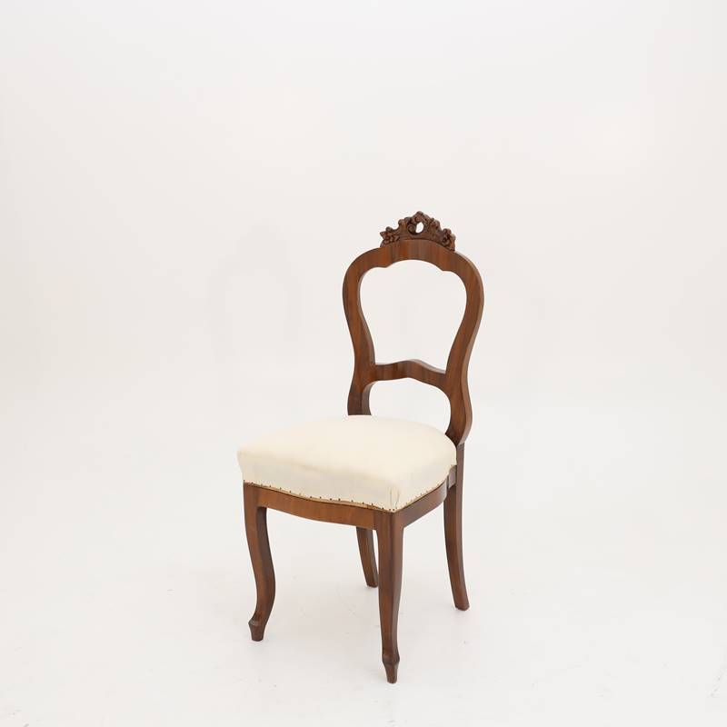 Sechs Spätbiedermeier Stühle Donaumonarchie 1840. Nussbaum furniert. Offene Rückenlehne. Neu gepolstert, weißer Stoffbezug. Größe ca. 41 x 43 cm, Höhe ca. 101 cm, Sitzhöhe ca. 54 cm. Altersbedingter Zustand, Polster teils verschmutzt.