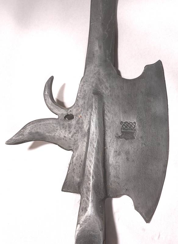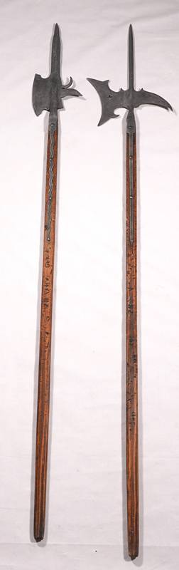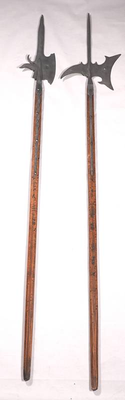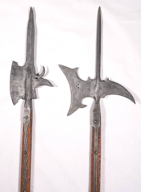 Spätere Repliken nach Vorbildern aus dem 14.-15. Jh. Je mit Metallklinge bestehenden aus Sichel und Spieß auf Holzschaft, verschieden bezeichnet. Länge je ca. 1,98 cm, Gewicht je ca. 2,8 kg. Zustand wie abgebildet. Kein Versand möglich, wir empfehlen gerne eine Spedition.