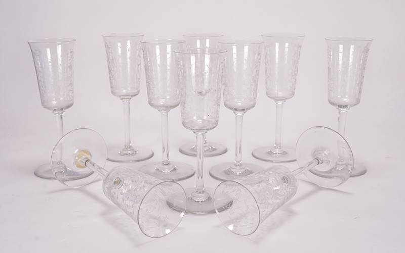 Frankreich 20. Jh. Kristallglas mit Ätzdekor in Form von Tieren und Blätterranken. Stängelglas mit nach oben hin leicht geöffnetem Kelch. Unter dem Boden geätzte Marke. Durchmesser des Standes ca. 7,5 cm, Höhe ca. 17,5 cm.