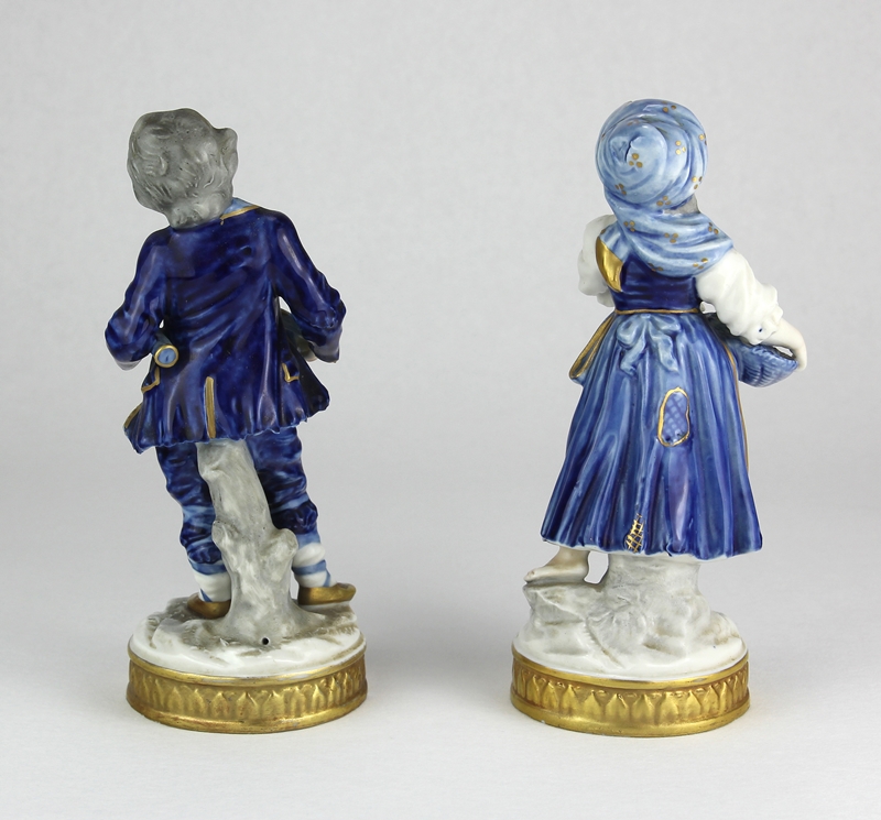 Figurenpaar Volkstedt 20. Jh. Porzellan, farbig staffiert. Mann und Frau in blauer Kleidung. Sie trägt einen Korb mit Blumen. Jeweils unter dem Boden unterglasurblaue Manufakturmarke. Größe ca. 5,5 x 5,5 cm, Höhe ca. 14 cm. Teils best.