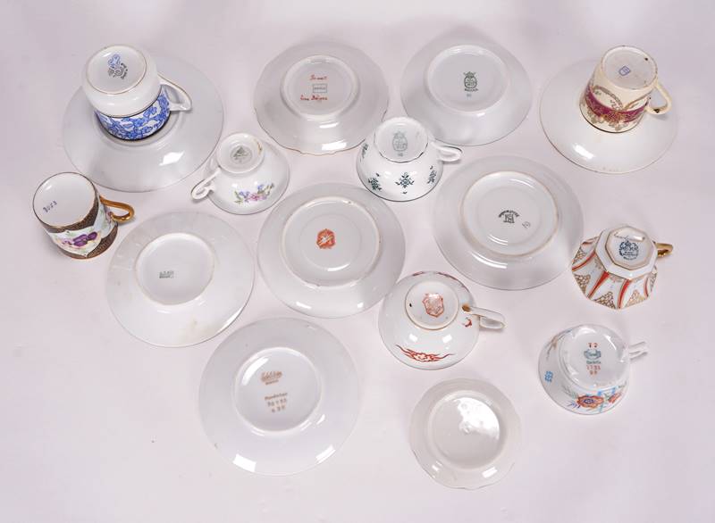 Meist Deutsch 20. Jh. Sechs Tassen mit Unteren von Beyer & Bock, acht weitere Tassen mit sieben teils zugehörigen Unteren, verschiedene Hersteller. Dazu ein kleines Schälchen von Rosenthal mit Wijnblad Design, drei kleine Tellerchen und eine Teebeutelablage aus Limoges. Ca. 32 Teile. Maximaler Durchmesser der Unteren ca. 14 cm. Teils bestoßen, teils berieben.