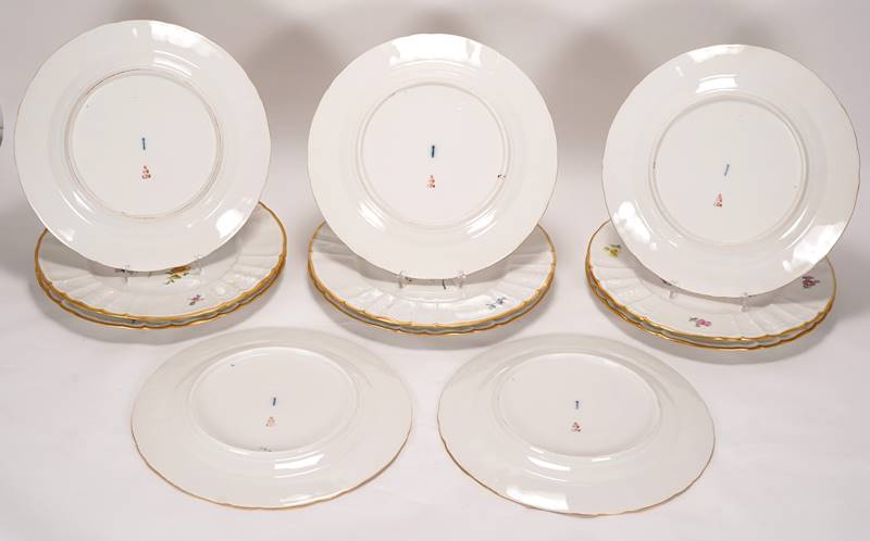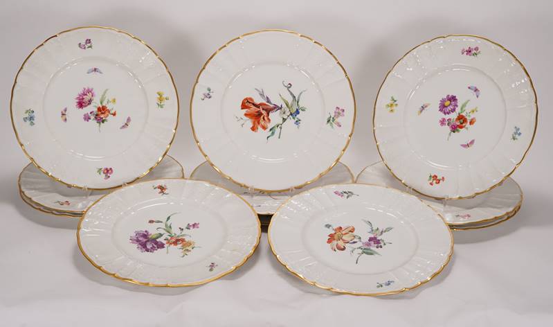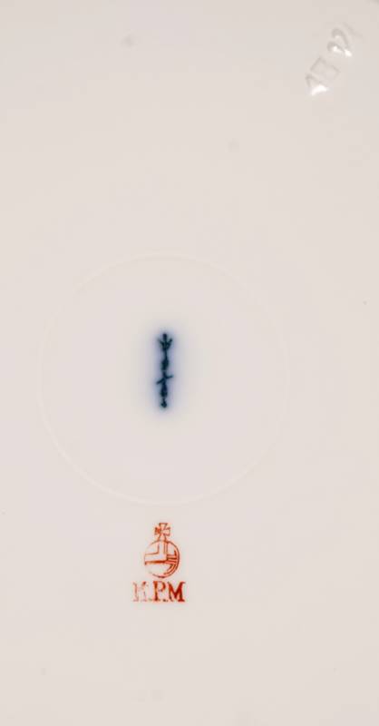Königliche Porzellanmanufaktur Berlin 20. Jh. Form Rocaille mit Blumenmalerei und Insekten sowie Goldrand. Unter dem Boden unterglasurblaue Zeptermarke mit rotem Reichsapfel, eingeprägtem Jahresbuchstabe und gemalter Nummerierung. Durchmesser ca. 27,5 cm, Höhe ca. 2,5 cm. Goldrand minimalst berieben.