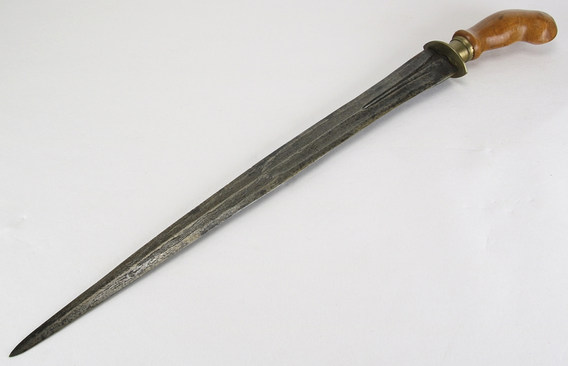 Wohl Afghanistan 19. Jh. Holzgriff und zweiseitige Klinge. Holzscheide mit Metallapplikationen. Länge ca. 55 cm, Klinge ca. 38 cm, Gewicht ca. 420 Gramm.