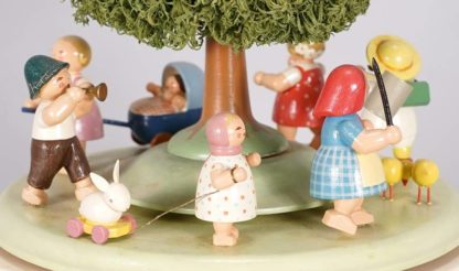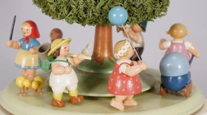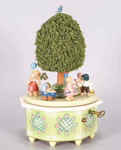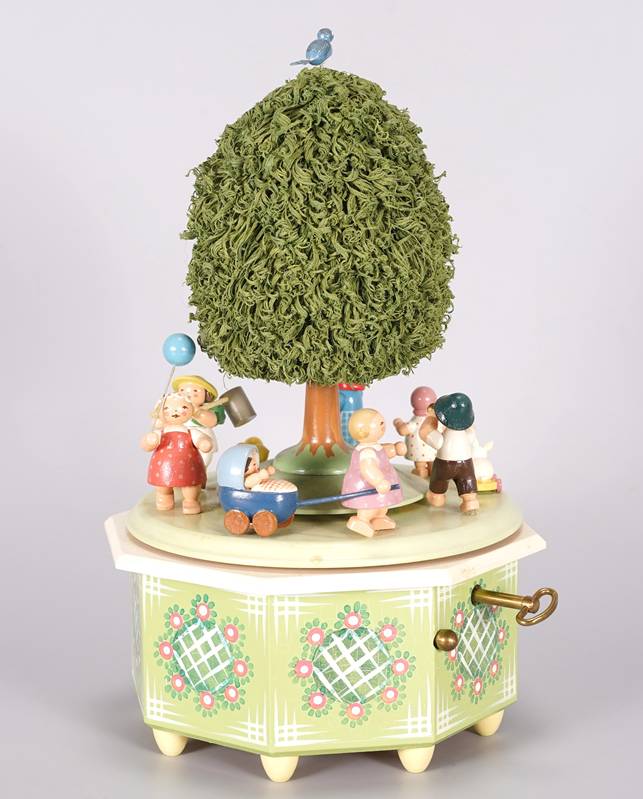 Wendt & Kühn. Spieldose "Kinderreigen". Melodie "Komm lieber Mai...". Nach einem Entwurf von Grete Wendt aus dem Jahr 1925/26. Höhe ca. 27 cm. Läuft an. Mit leichten Gebrauchsspuren und Altersspuren. Mit Karton.