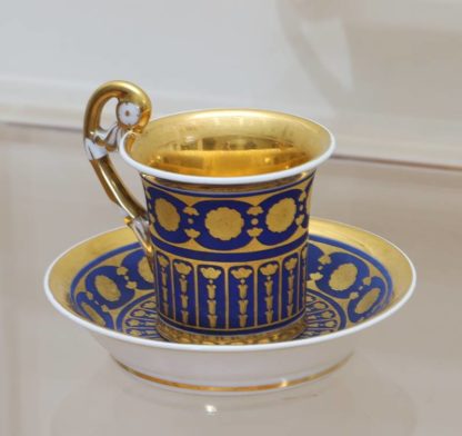 Biedermeier Sammeltasse Deutsch 19. Jh. Porzellan in Blau mit reicher Goldstaffage. Größe ca. 9,5 x 12,5 cm.
