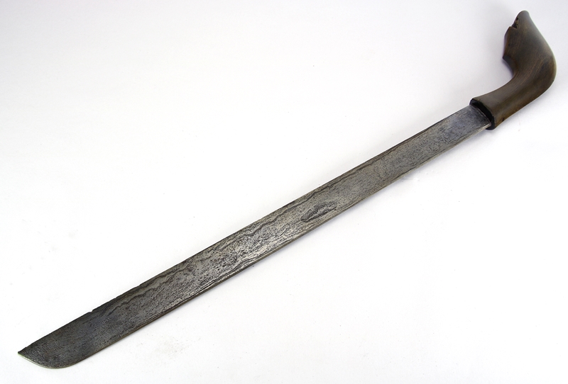 Indonesien 19. Jh. Tropenholzgriff und damaszierte Schneide. Tropenholzscheide teils mit Metallapplikationen. Länge ca. 66 bzw. Klinge ca. 50 cm, Gewicht ca. 900 Gramm. Altersbedingt guter Zustand.