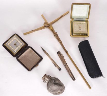 Konvolut Vermischtes Zwei Reisewecker, ein Kruzifix Messing, eine Kleingeldbörse versilbert mit alten Geldscheinen und ein Füller 1930-er Jahre mit passendem Bleistift. Größe Kruzifix ca. 35 x 21 cm. Nicht geprüft. Bitte selbst besichtigen.