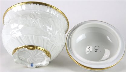 aus dem Schwanenservice. Entwurf Johann Joachim Kaendler für Heinrich Graf von Brühl im Jahr 1737. Ausführung Meissen um 1924. Reliefdekor mit reicher Goldstaffage. Unten unterglasurblaue Schwertermarke mit zwei Schleifstrichen. Durchmesser ca. 10,5 cm, Höhe ca. 10,5 cm. Guter Zustand.