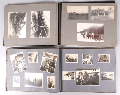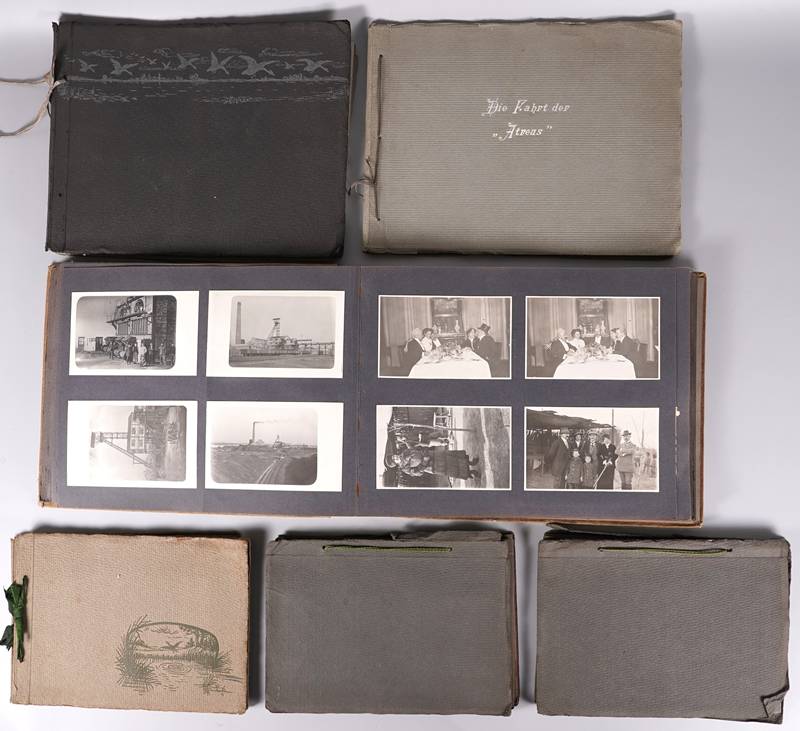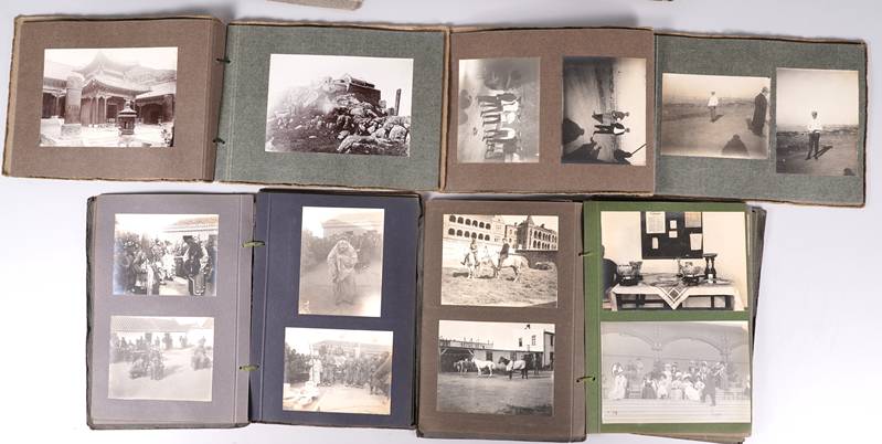 Deutsch/China um 1900. Insgesamt sieben Alben aus der Zeit mit diversen Fotografien. Die Stadt Tsingtau/Qingdao gehörte von 1898 bis 1919 als deutsche Kolonie Kiautschou zum Deutschen Reich. Diese Alben dokumentieren diese Zeit und diesen Ort. Max. Größe ca. 26 x 34 cm.