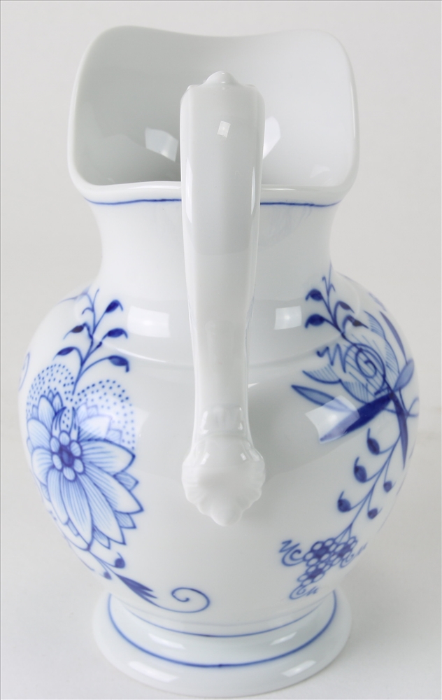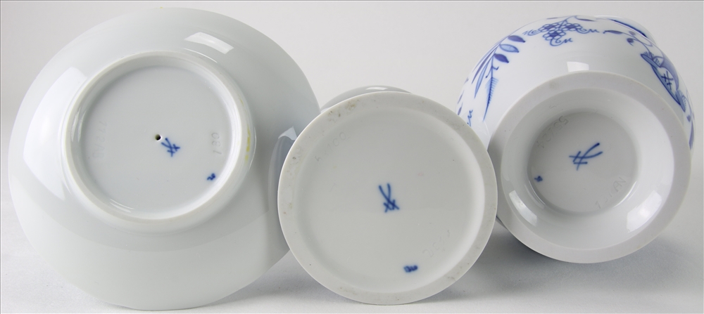 Meissen 20. Jh. Form Neuer Ausschnitt mit Zwiebelmuster. Kanne, Eierbecher und Kerzenleuchter. Jeweils unterglasurblaue Schwertermarke (1. Wahl). Höhe Kanne ca. 13 cm.