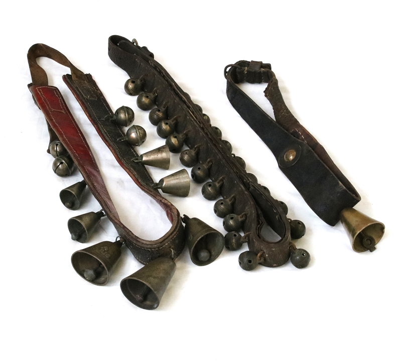 Süddeutsch um 1900. Eine Ziegenglocke und zwei weitere mit mehreren Glocken bzw. Schellen. Altersbedingter Zustand.