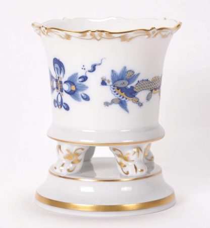 Königliche Porzellanmanufaktur Meissen 20. Jh. Form Neuer Ausschnitt, Dekor Reicher Drache kobaltblau, goldstaffiert. Kleine Kratervase auf vier Löwenfüßchen auf rundem Sockel. Unter dem Boden unterglasurblaue Schwertermarke, Formnummer sowie Malermarke. Durchmesser ca. 7 cm, Höhe ca. 9 cm.