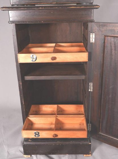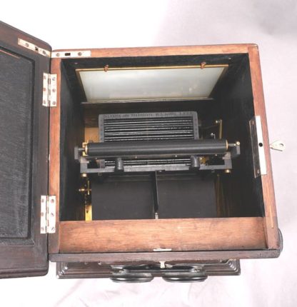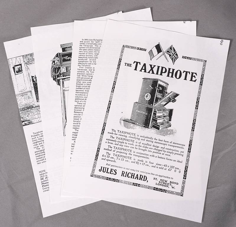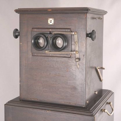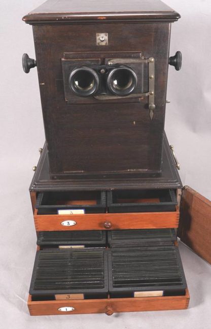 Anfang 20. Jh. Jules Richard, Paris. Le Taxiphote. Holzkorpus. Stereobetrachter mit Unterbau für Glasdias, lose auf Unterschrank. Unterbau und Unterschrank mit Schubladen, nicht vollzählig und seitlich je zwei Handhaben. Größe ca. 33 x 33 cm, Höhe ca. 50 cm. Unterschrank für weitere Dias ca. 38 x 38,5 cm, Höhe ca. 75 cm. Gebrauchter Zustand. Funktion nicht geprüft, bitte selbst besichtigen. Kein Versand möglich. Wir empfehlen ihnen gerne eine Spedition.