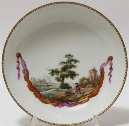 18. Jh. Porzellan. Runder, tiefgemuldeter Fond mit Goldrand und unterschiedlichen Kauffahrteiszenen im Spiegel. Unterglasurblaue Schwertermarken mit Stern (Marcolini Zeit), 1. Wahl. Durchmesser ca. 13,5 cm, Höhe ca. 33 cm. Schöner Zustand.
