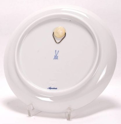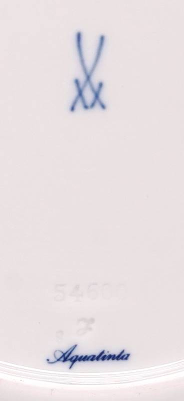 Meissen Zierteller Königliche Porzellanmanufaktur Meißen 20. Jh. Runder Teller mit Aquatinta-Dekor und Goldstaffage. Unter dem Boden unterglasurblaue Schwertermarke, gepresste Formnummer sowie Bezeichnung Aquatinta. Durchmesser ca. 18 cm.