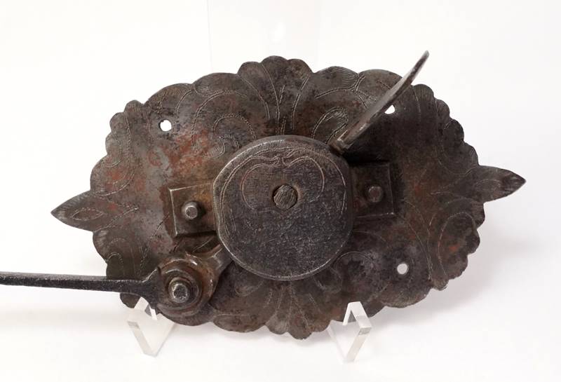 Barocker Schließmechanismus Deutsch 18. Jh. Eisen. In Blattform getriebener, ziselierter Beschlag mit mechanischem Riegel. Größe ca. 63 x 15 cm. Höhe ca. 6 cm. Gewicht ca. 700 Gramm.