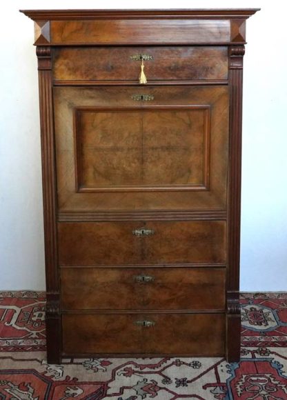 Deutsch 19. Jh. Nussbaum. Drei Frontschubladen und eine Kopfschublade. Hinter der Schrägklappe, reiches Innenleben mit mehreren Schubladen und einem Mittelfeld von ebonisierten Säulen gerahmt. Schöne Bandintarsien. Größe ca. 102 x 53 cm, Höhe ca. 163 cm. Zustand wie abgebildet.