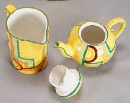 Schramberger Majolika-Fabrik 1930er Jahre. Heller Scherben, Dekor wohl Eva Zeisel. Ein Krug, eine Teekanne und ein Teller mit geometrischem Dekor auf gelbem Grund. Je unter dem Boden schwarze Herstellermarke teils nummeriert 62 und 69, sowie weitere geprägte Nummern. Durchmesser des Krugs ca. 10,5 cm, Höhe ca. 17 cm. Rand des Kruges stark bestoßen und altrestauriert. Teekanne an Rändern, Ausguss und Handhabe bestoßen.