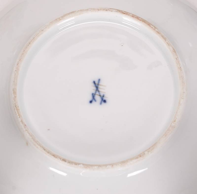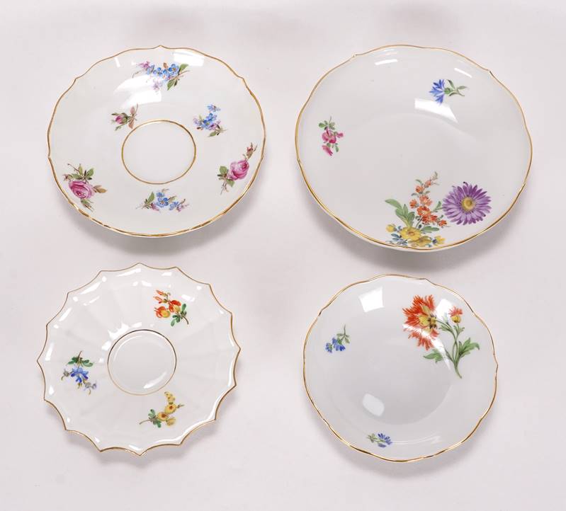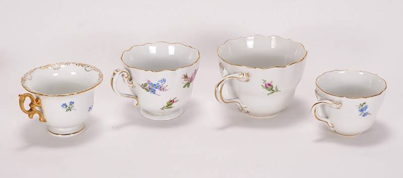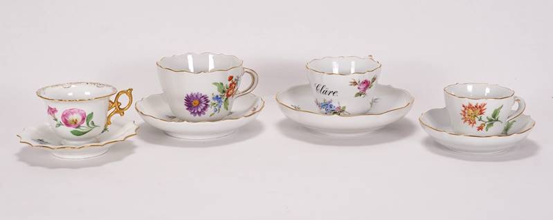 Vier Tassen Meissen Porzellanmanufaktur Meissen 19./20. Jh. Eine Kaffeetasse und eine Mokkatasse, je mit Unterer, Form Neuer Ausschnitt mit Blumenmalerei und Goldrand. Unter dem Boden unterglasurblaue Schwertermarke, 1. Wahl, Beistrich, Malermarke und Formnummer. Eine weitere Tasse mit Unteren mit Blumenmalerei und Goldrand, sowie Namenszug Cläre. Unter dem Boden Knaufschwertermarke mit vier Schleifstrichen. Und eine Mokkatasse mit unterem, wohl nicht zugehörig, mit Blumenmalerei und Goldrand. Einmal unter dem Boden Jubiläumsmarke 1710-1935 und Schwertermarke, je 1. Wahl. Maximaler Durchmesser ca. 14,5 cm, Höhe ca. 3,5 cm. Goldrand teils berieben, einmal Stand minimal bestoßen.