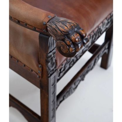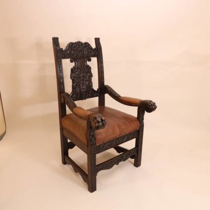 Ende 19. Jahrhundert. Armlehnstuhl aus Eiche mit hoher, geschnitzter Rücklehne und gepolsterten Armlehnen, die in Löwentatzen enden. Auf den Beinen, den vorderen Zargen und Verstrebungen weitere geschnitzte Voluten, Maskarons und Rankendekore. Die Rücklehne zeigt auf dem Mittelbrett eine Jungfrau und einen Wassermann eine Kartusche haltend. Weitere Mascarons und Ranken auf der Rücklehne rahmen die Szene. Die Sitzfläche ist ebenfalls mit einem genieteten braunen Leder bezogen. Größe ca. 68 x 70 cm, Höhe ca. 124 cm, Sitzhöhe ca. 55 cm.