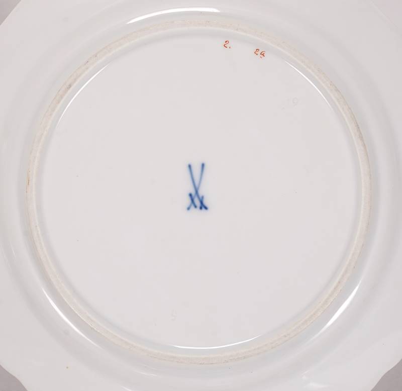 Vier Kuchenteller Meissen Porzellanmanufaktur Meissen 20. Jh. Form Neuer Ausschnitt, Dekor Streublümchen. Unter dem Boden unterglasurblaue Schwertermarke, 1. Wahl, sowie Formnummer und Malermarke. Durchmesser ca. 18 cm, Höhe ca. 2,5 cm.