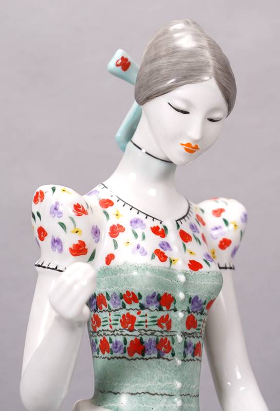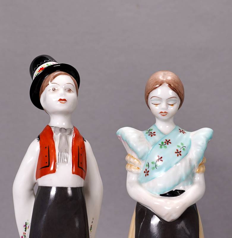 Ungarn 20. Jh. Hollóháza Manufaktur. Drei Porzellanfiguren, polychrom gefasst. Jeweils in Folkloretracht gekleidete Figuren. Unter dem Boden jeweils mit Manufakturmarke und diversen Nummern. Max. Größe ca. 10 x 8,5 cm, Höhe ca. 23,5 cm. Kleine Mädchenfigur ist restauriert, geklebt.
