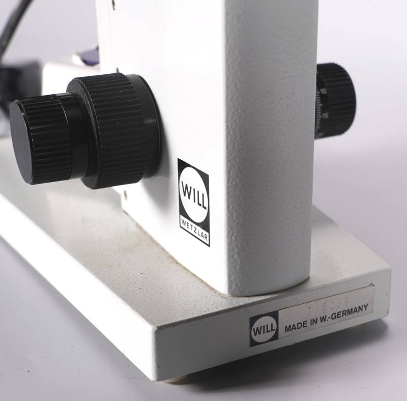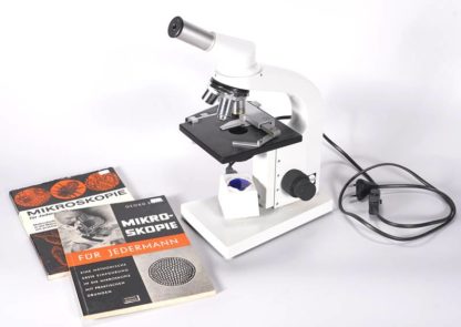 Wetzlar. Monokular Tubus, dreifach Objektivrevolver, Zusatzbeleuchtung. Größe ca. 14 x 28 cm, Höhe ca. 34 cm. Gewicht ca. 4 kg. Dabei zwei Bücher zur Einführung in die Mikroskopie. Funktion nicht geprüft, bitte selbst besichtigen.