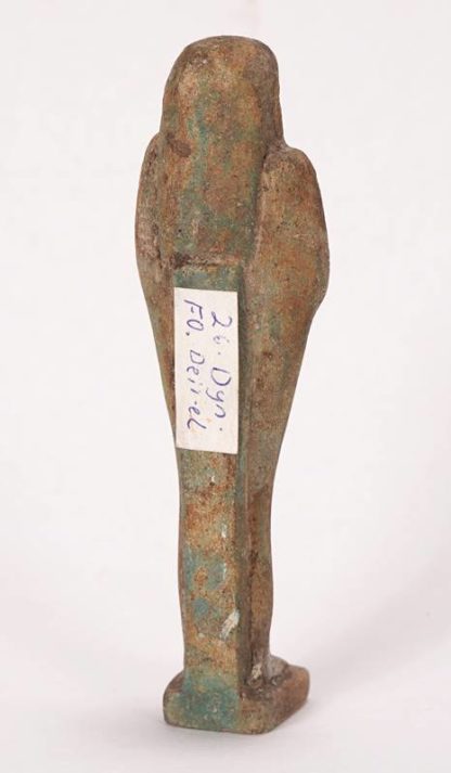 Uschebti Ägypten wohl Spätzeit um 600 v. Chr. Fayence mit Resten blau-grüner Glasur. Mumienförmige Grabbeigabe mit vor der Brust gekreuzten Armen. Darunter Hieroglyphenreihen. Verso Sammleretikett mit Datierung 26. Dynastie und Fundort Deir el. Größe ca. 3,5 x 2 cm, Höhe ca. 11,2 cm, Gewicht ca. 45 Gramm. Teils berieben und bestoßen. Altersbedingter Zustand wie abgebildet. Aufgrund der schwierigen Sachlage kann keine Garantie für Herkunft oder Alter übernommen werden. Bitte besichtigen Sie selbst. Aus einer Frankfurter Privatsammlung mit Provenienz teils aus der Spezialfunktion Sammlung ägyptischer Kunst Auktionshaus Weidler 2006 und anderen Auktionshäusern im Raum Frankfurt. Wir machen darauf aufmerksam, dass dieser Gegenstand nicht aus Deutschland ausgeführt werden darf.