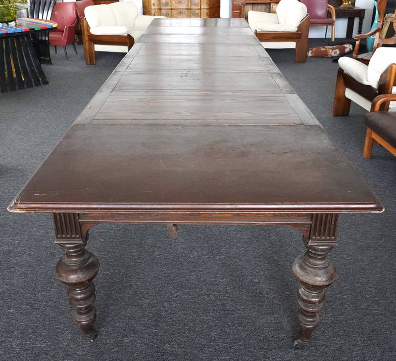 Um 1880. Historismus. Eiche massiv. Tischbeine gedrechselt. Ausziehbare Tischplatte mit einsetzbaren Platten. Auf Rollen montiert. Größe ca. 147 x 120 cm, Höhe ca. 77 cm. Im abgebildeten Zustand mit 6 Platten ausgezogen auf 4,65 m. Insgesamt 8 Platten à 52 cm anbei. Ein Stützbein fehlt. Altersbedingter Zustand.
