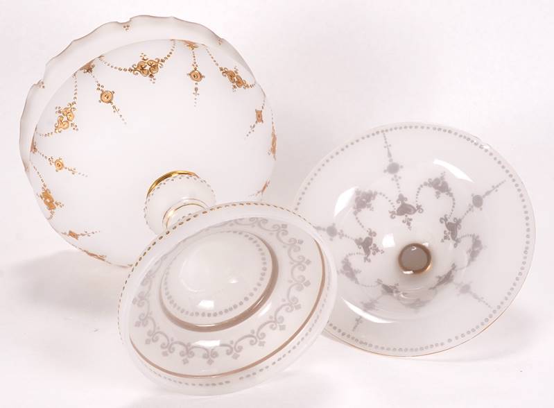 Deckelschale 19. Jh. Mattiertes Glas, mit Goldstaffage. Schale auf rundem Fuß, geschwungener Rand und aufragender Deckel mit Knauf. Größe ca. 16,5 x 16,5 cm, Höhe ca. 26 cm. Schalenrand einmal best., Deckelrand einmal best., Dekor teils berieben.