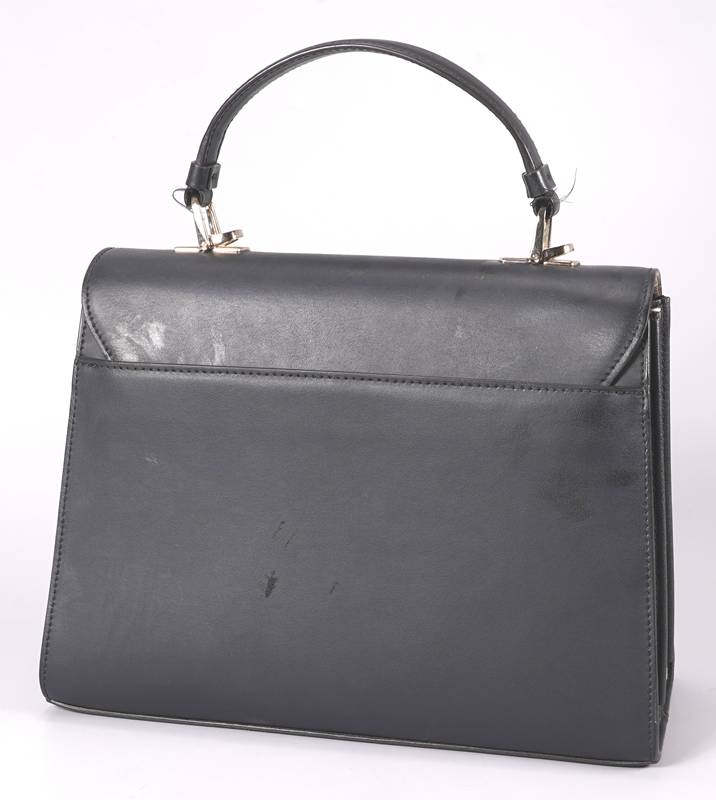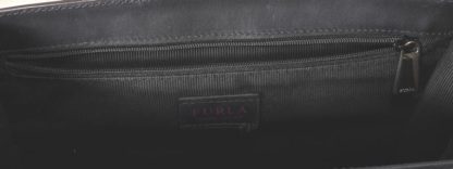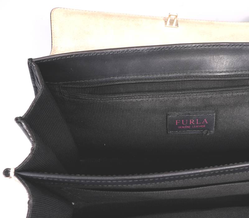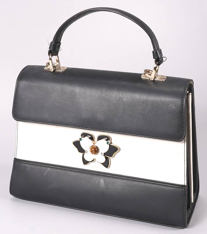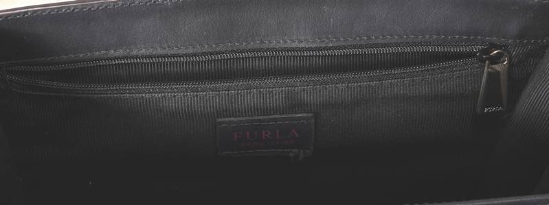 Lederhandtasche in Schwarz und Weiß, mit Henkel und Blumenapplikation. Innen mit zwei Hauptfächern, diese jeweils mit Nebenfach. Innen eingenähtes Etikett mit Markennamen. Außen unter der Blüte mit Markennamen "Furla". Größe ca. 26,5 x 11 cm, Höhe ca. 20 cm (mit Henkel ca. 30 cm. Leichte Gebrauchsspuren.