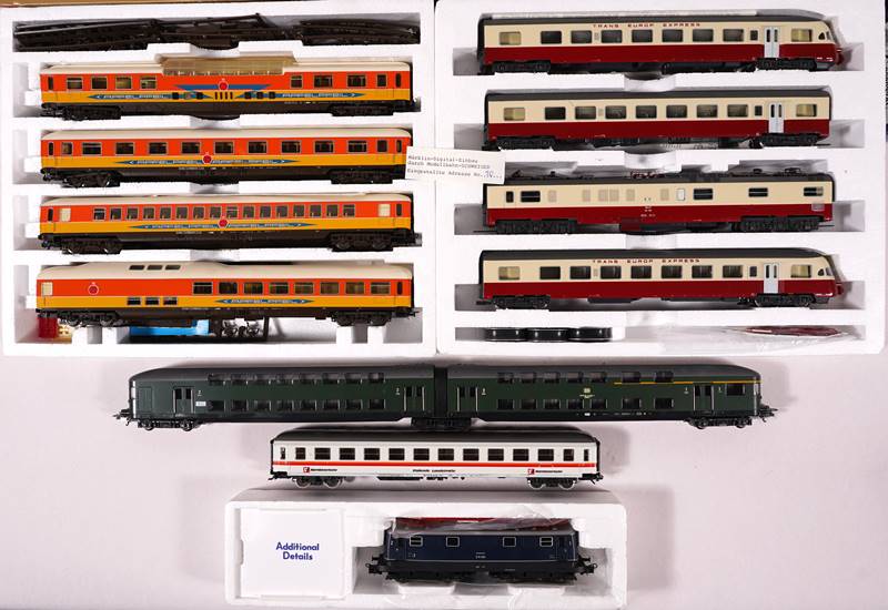 Konvolut LIMA Märklin für LIMA, H0, Wechselstrom, Nr. 149812, TEE Cisalpin Gottardo, Digitalumbau, Adresse 10. Wagenpackung, Nr. 149700X14, Personenwagen Apfelpfeil, teils mit Anbauteilen (evtl. zugehörig). E-Lok E10 005, in Packung Nr. 208032AC, Wechselstrom Umbau. In falscher Verpackung ein Personenwagen Rollende Landstraße und ein Doppelstockwagen mit Drehgestell der DB, 50 80 26-2U 803-5. Aus einer süddeutschen Privatsammlung. Zustände wie abgebildet, Funktion nicht geprüft, teils eventuell Fehlteile, teils eventuell beschädigt. Bitte selbst besichtigen.