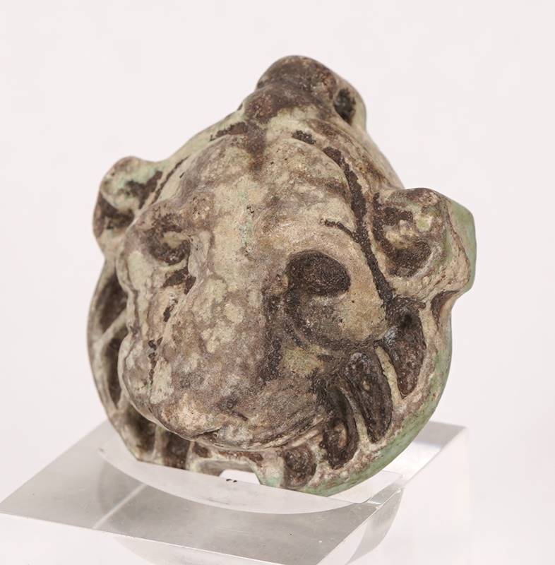 Löwenamulett Ägypten wohl Spätzeit, ca. 664 - 31 v. Chr. Fayence mit Resten grün-blauer Glasur. Amulett in Form eines Löwengesichts, wohl Schutzamulett des Bes. Größe ca. 3,8 x 3,8 cm. Gewicht ca. 17 Gramm. Teils bestoßen, teils berieben. Altersbedingter Zustand wie abgebildet. Aufgrund der schwierigen Sachlage kann keine Garantie für Herkunft oder Alter übernommen werden. Bitte besichtigen Sie selbst. Aus einer Frankfurter Privatsammlung mit Provenienz teils aus der Spezialauktion Sammlung ägyptischer Kunst Auktionshaus Weidler 2006 und anderen Auktionshäusern im Raum Frankfurt. Wir machen darauf aufmerksam, dass dieser Gegenstand nicht aus Deutschland ausgeführt werden darf.